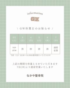 こんにちは、なかや整骨院です🦴いつもご利用ありがとうございます。GWの営業日のお知らせです🎏5/2(土)は連休前のため、9:00〜19:00のロング営業いたします✨(1 […]